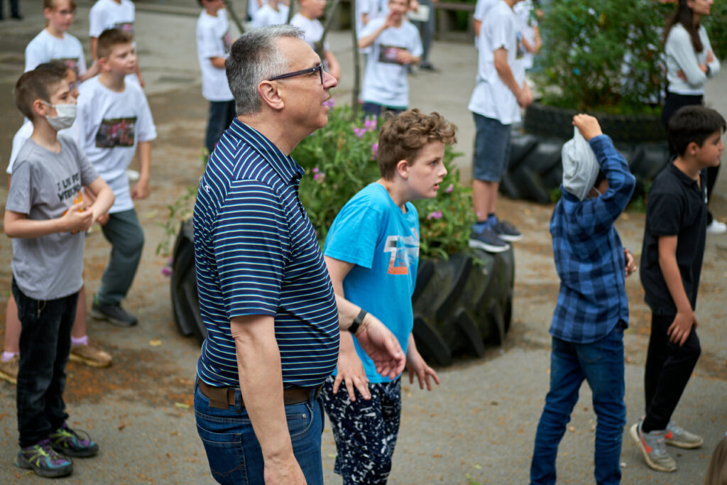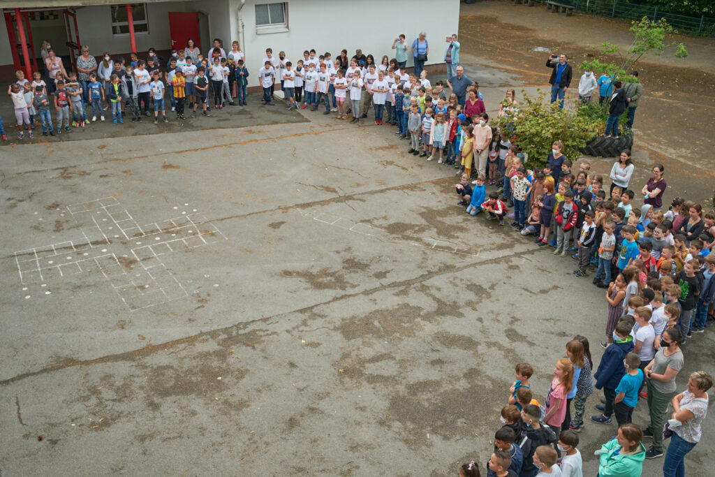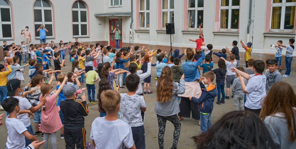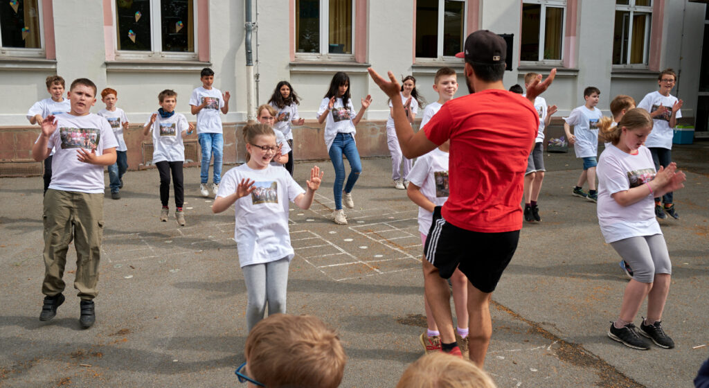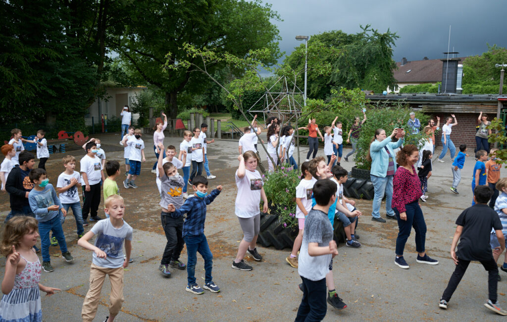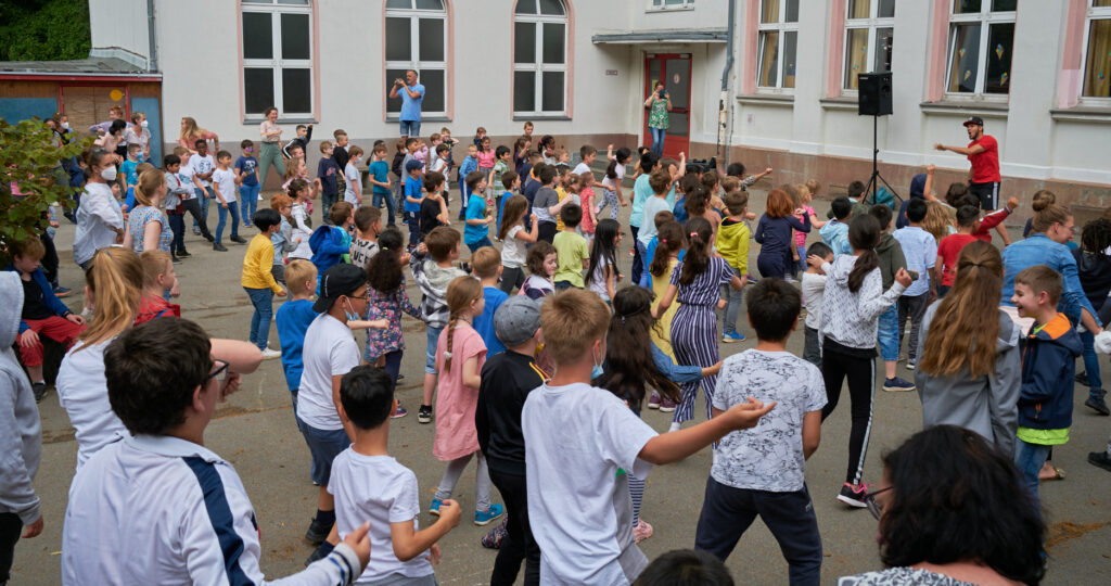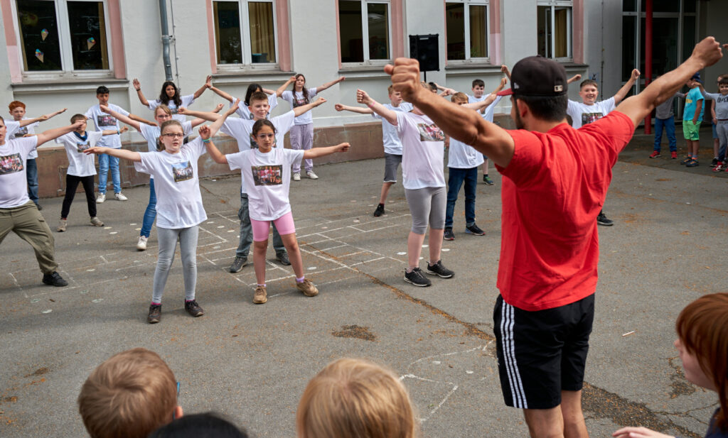 Nachdem Frau Diethert die Siegerurkunden vom Sportfest verteilt hatte, gab es dann dieses Jahr ein ganz besonderes Event zum Abschied: Die Lehrerinnen der Klassen 4 – Frau Burghardt und Frau Schulte – hatten Herrn Murat Güclü von „Step by Step – Starke Erlebnisse“ engagiert, der mit den Kindern der Klassen 4 vorab in einem Workshop eine Tanz-Choreographie einstudiert hatte, die die Schüler:innen unter seiner Leitung hier zum Abschied auf dem Schulhof zum Besten gaben.