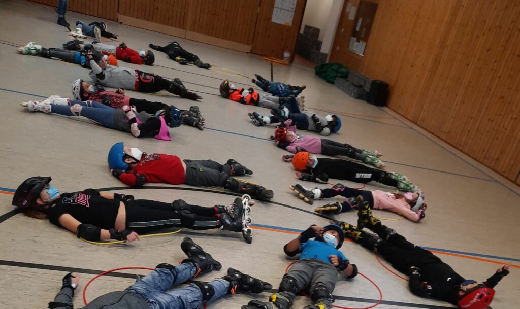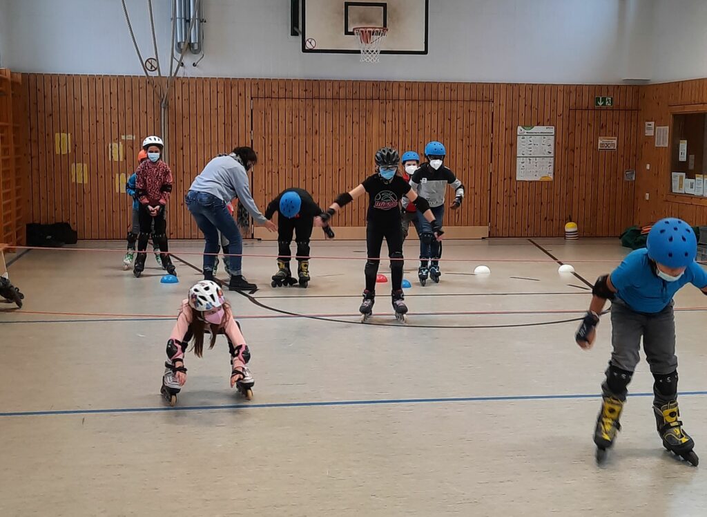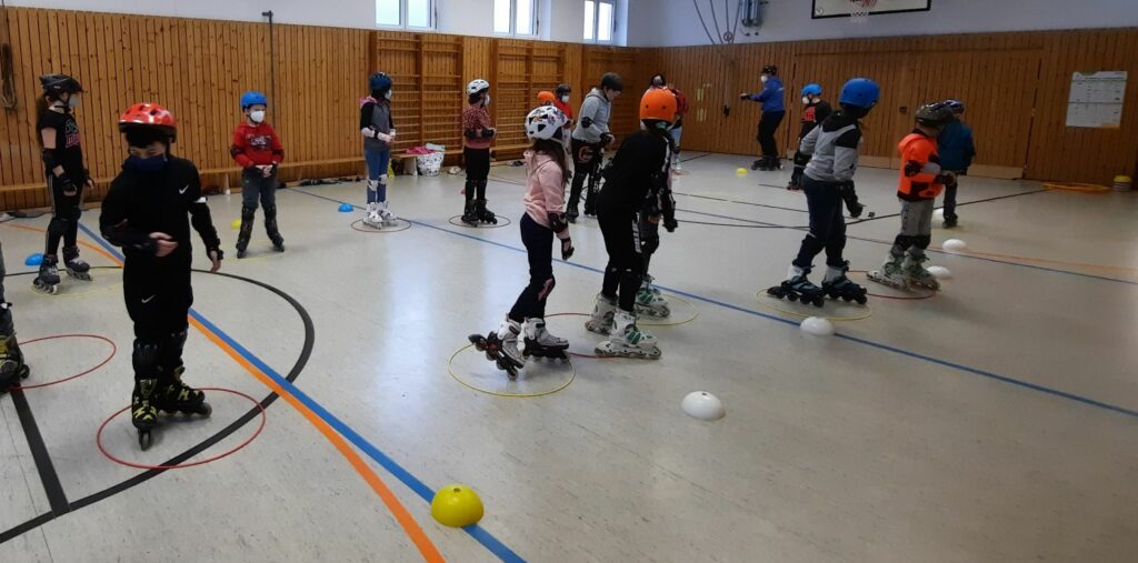An zwei Tagen im November hatten die Schülerinnen und Schüler der Klassen 3 und 4 die Chance sich zwei Stunden auf Inlinern auszuprobieren. Das Ziel der Einheit: Jedes Kind rollt am Ende! Und das ist gelungen. Das Team von „Skate @ school“ hat sich mit tollen Übungen und Spielen ein unterhaltsames Programm ausgedacht, bei dem die Schülerinnen und Schüler sich (geschützt mit Schonern) richtig ausprobieren konnten: Wie stehe ich am besten vom Boden wieder auf? Wie tief kann ich in die Knie, um unter dem Seil drunter her zu kommen? Kann ich auch einen Ring auf dem Kopf balancieren beim Slalom fahren?